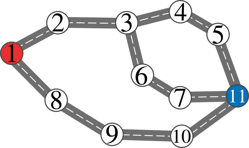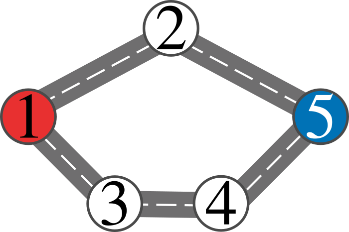 注意,警察的最优策略是等待球迷俱乐部到达目的地(即顶点 5)的相邻顶点,然后封锁连接该顶点与目的地的边。球迷俱乐部的最优策略是沿上方的路径走(从 1 到 2),在看到 2 到 5 之间的边被封锁后,他们会折返经过 2 回到 1,然后沿下方的路径(1 到 3 到 4 到 5)走。在这种情况下,经过的道路总数为 5。