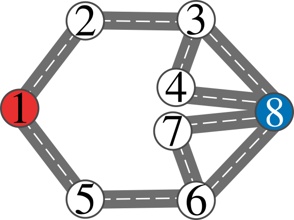 警察的最优策略是:如果球迷俱乐部到达顶点 2,则封锁 2 到 3 的边;或者如果球迷俱乐部到达顶点 5,则封锁 5 到 6 的边。在这种情况下,最优路径是 $1 \to 2 \to 1 \to 5 \to 6 \to 8$。该策略下经过的道路总数为 5。