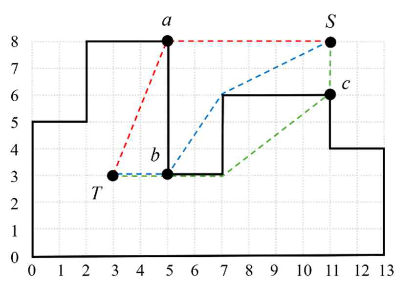 图 E.1 展示了一座陵墓以及从 $S$ 到 $T$ 的几条可能路径,其中顶点仅被穿过一次。经过顶点 $a$ 的路径总长度为 $11.385165 = 6 + \sqrt{29}$,经过顶点 $b$ 的路径长度为 $10.077687 = \sqrt{20} + \sqrt{13} + 2$,经过顶点 $c$ 的路径长度为 $11.0 = 2 + \sqrt{25} + 4$。其中,最短路径是经过顶点 $b$ 的那条。