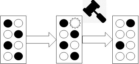 This example shows what happens when the top right peg is “hammered.” ($\circ = \text{up}$, $\bullet = \text{down}$)